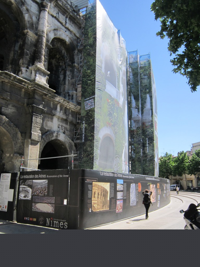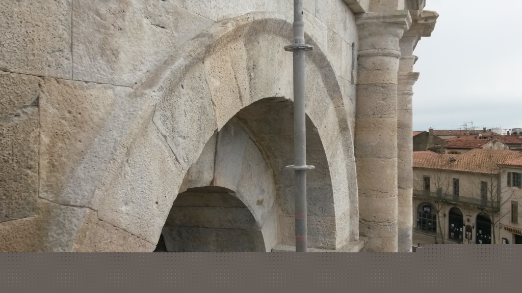 Contexte : La restauration de ces 4 travées fait suite à une première tranche expérimentale qui a permis la mise au point des techniques de restauration. Cette phase initie le début de la restauration de l’ensemble des travées de l’édifice (64) , initiée par la Mairie de Nîmes.