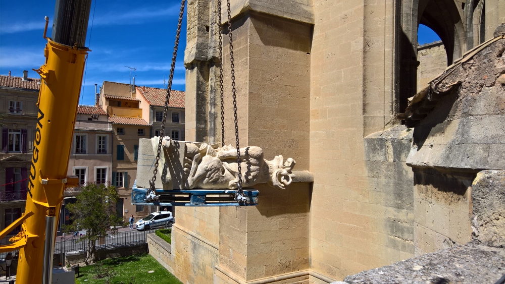 Contexte : La cathédrale est située en centre-ville et est attenante à la Mairie. L’étroitesse des rues ainsi que l’ouverture du jardin et du cloître au public engendrent des difficultés d’approvisionnement, d’organisation et de maintien de la sécurité du public, comme celle des compagnons. En outre, nous sommes contraints à limiter les nuisances liées au chantier : poussière, bruit…