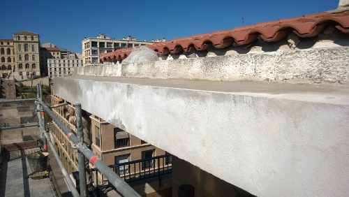 Techniques utilisées : Reprise de l’acrotère en béton (purge, application d’un inhibiteur de corrosion, ragréage du béton au mortier weber).
